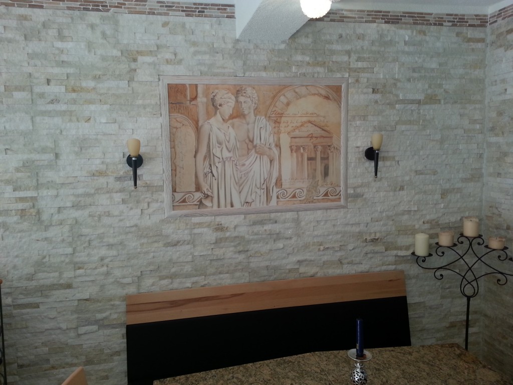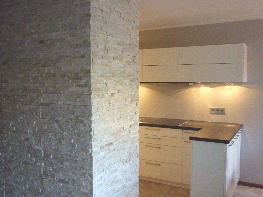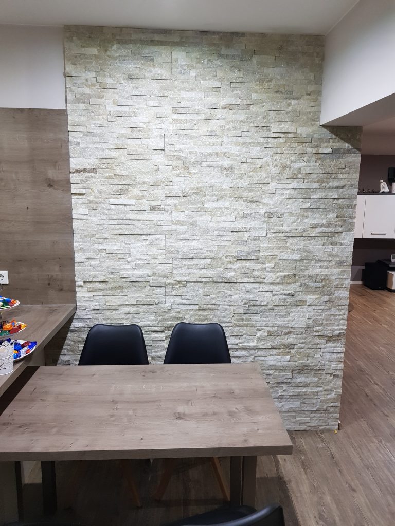 Wandverblender Creme Material: Quarzit Farbe: Creme-weiß, glitzernd Module 60×15 cm (Streifen zu Modulen verklebt) Dicke: ca.15-25 mm Außenecken erhältlich Für den Innen- und Außenbereich